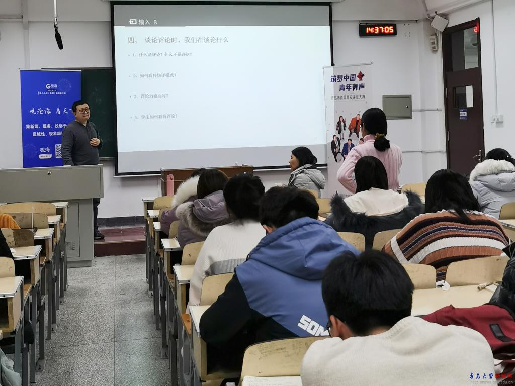 新闻网讯 12月9日,新闻与传播学院在博知楼举办了“互联网时代评论的可能性”主题讲座。本次讲座有幸邀请到了青岛日报社理论评论部主任鞠培霞和评论员、历史作家王学义与大家分享新闻评论的经验,两位老师耐心解答了同学们在新闻评论创作过程中遇到的困惑。