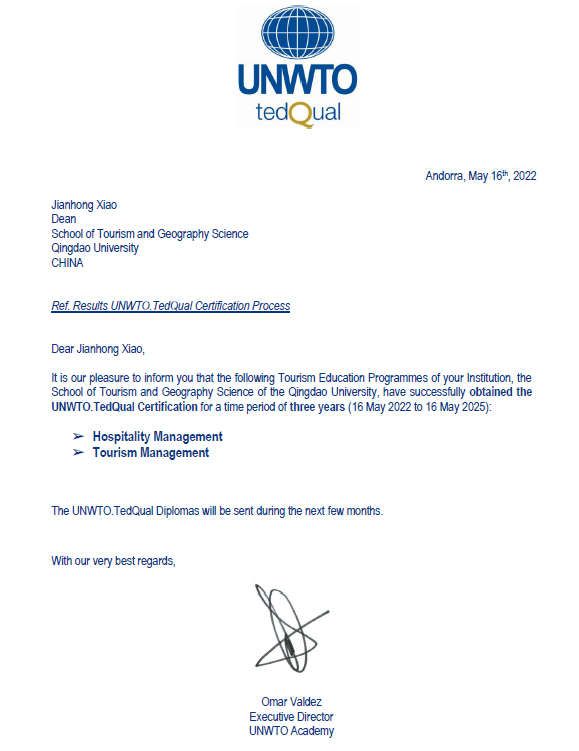新闻网讯 5月16日,联合国世界旅游组织教育质量认证委员会(UNWTO.TedQual)函告通知,伟德官网旅游与地理科学学院旅游管理、酒店管理两个本科专业通过该机构的旅游教育质量国际认证,认证有效期3年,这是目前伟德官网第一个国际专业认证,也是山东省首家通过该项国际认证的本科高等院校。伟德官网旅游管理、酒店管理两个本科专业是首次参与联合国世界旅游组织教育质量认证。