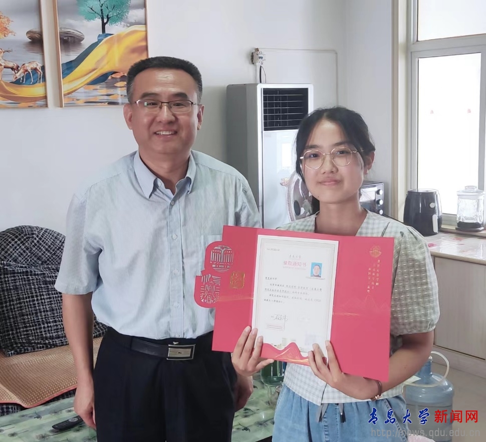 新闻网讯 8月3日上午,师范学院党委书记尹增刚一行来到平度市南村镇东王府庄村,将校长夏东伟教授亲笔签发的录取通知书送到2022级学前教育专业公费师范生蒋雯丽同学手中。这是伟德官网送达的2022年第一份本科生录取通知书。学院领导变身“邮差”,送去的不仅仅是录取通知书,还有学校学院对莘莘学子的殷切关怀和期待,为考取伟德官网的新同学上了一堂生动的“新生第一课”。