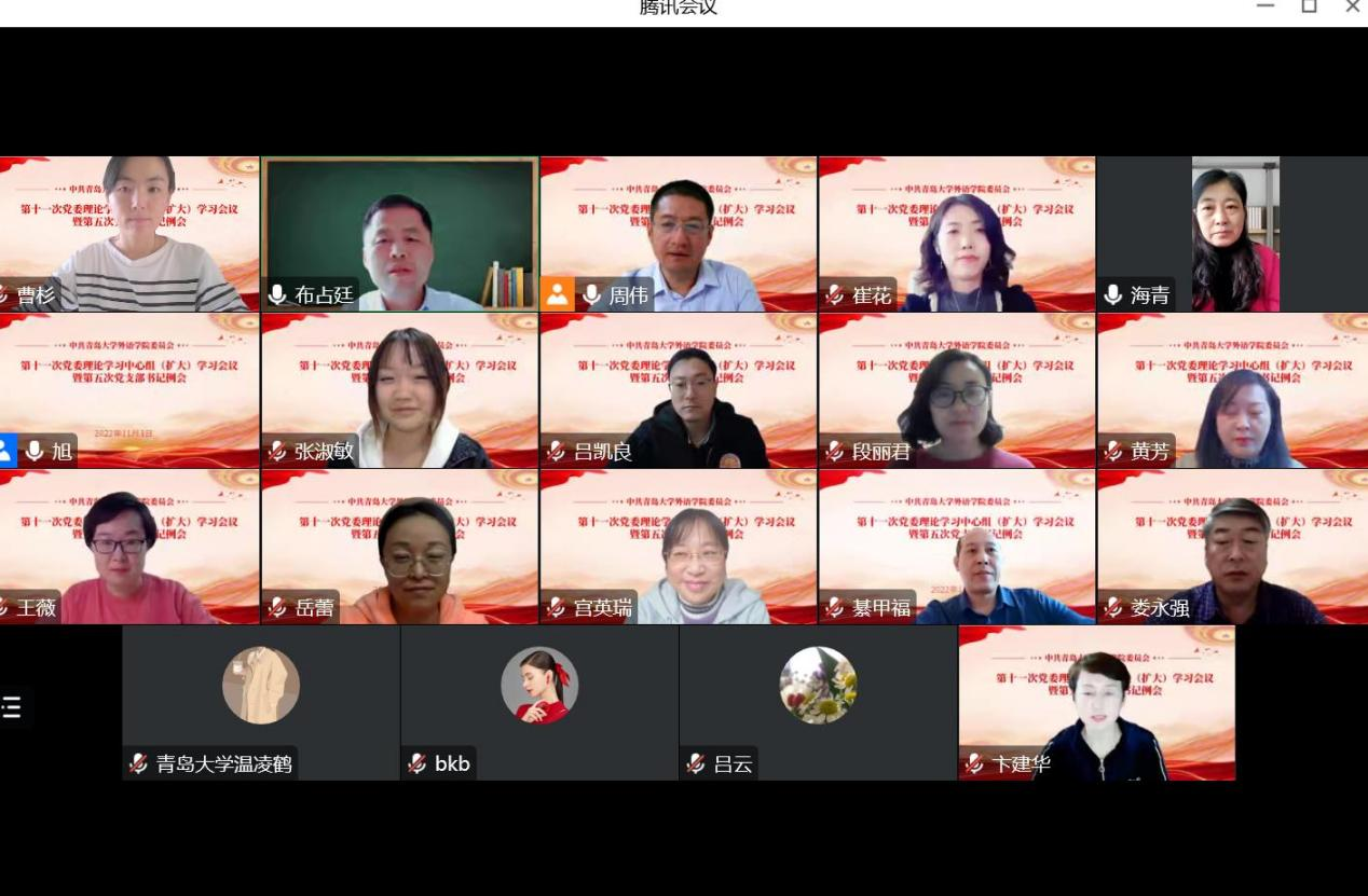新闻网讯 11月3日下午,外语学院党委通过腾讯会议线上召开第十一次党委理论学习中心组(扩大)学习会,专题学习党的二十大和二十届一中全会精神,研究部署贯彻落实意见。学院领导班子、党支部书记、系办中心主任和学科负责人参加会议,会议由学院党委书记周伟主持。