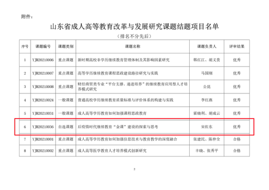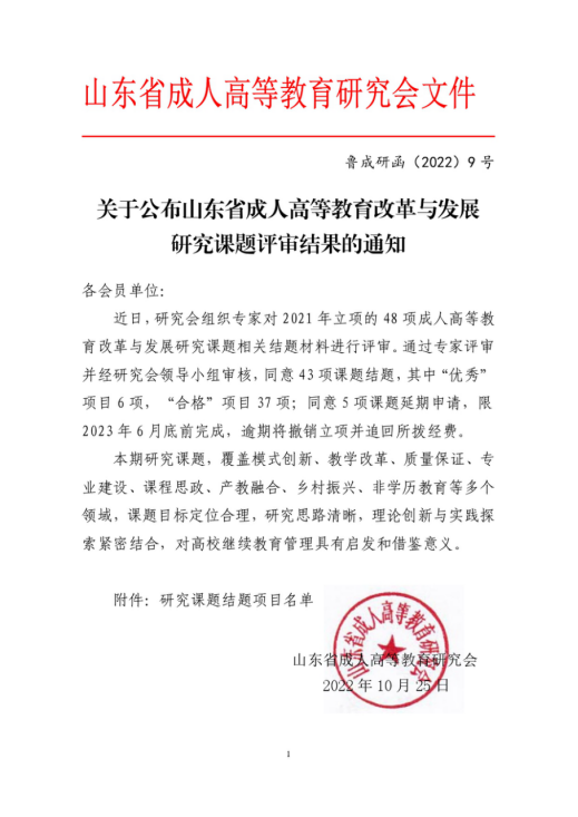 继续教育学院研究课题在2021年度山东省成人高等教育改革与发展研究课题评审活动中获评“优秀”