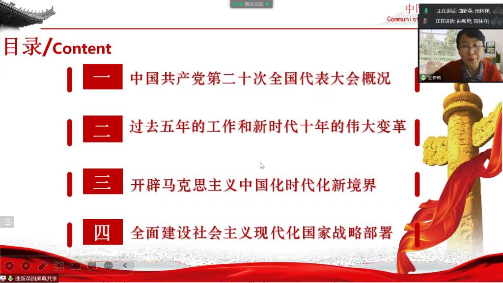 曲新英从中国共产党第二十次全国代表大会概况、过去5年的工作和新时代10年的伟大变革、开辟马克思主义中国化时代化新境界、全面建设社会主义现代化国家战略部署的四个方面,带领大家全面学习党的二十大报告精神,对党的二十大提出的新思想新论断、作出的新部署新要求进行了系统解读和深入阐释,进一步加深了大家对习近平新时代中国特色社会主义思想世界观、方法论的认识,深化了对以中国式现代化推进中华民族伟大复兴使命任务要求的认识。