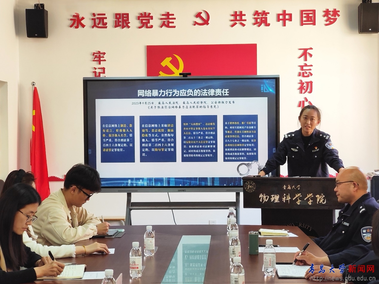新闻网讯 为积极践行总体国家安全观,深入开展国家安全和网络安全宣传教育,在第九个“全民国家安全教育日”到来之际,4月11日下午,伟德官网物理科学学院联合党委宣传部、党委学生工作部、党委保卫部在浮山校区博逸楼401举办“国家安全 青春挺膺”国家安全普法教育活动,并在党委保卫部110会议室举行国家安全暨网络安全校警联动工作研讨会。活动特邀青岛市公安局网警支队、崂山区委网信办、崂山公安分局网警大队、麦岛派出所警官授课。崂山区委宣传部、青岛市公安局警方代表、学校相关部门负责人和物理科学学院师生代表100余人参加。