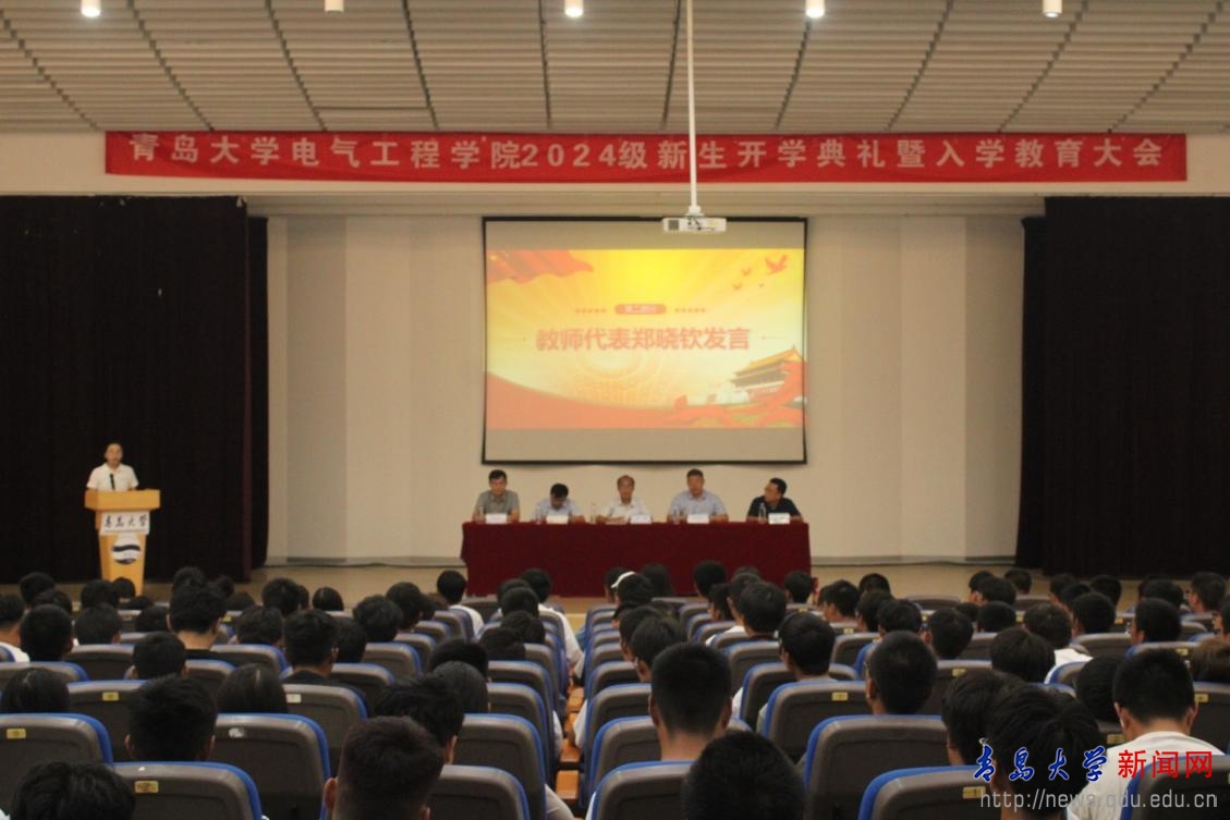 新闻网讯 9月28日晚,电气工程学院在金家岭校区图文中心四楼报告厅举行了2024级新生开学典礼暨入学教育大会。院党委书记李敏,院长张智晟和学院其他党政班子成员、各年级辅导员及2024级各班班主任以及2024级全体本科新生参会,大会由院党委副书记薛希洪主持。