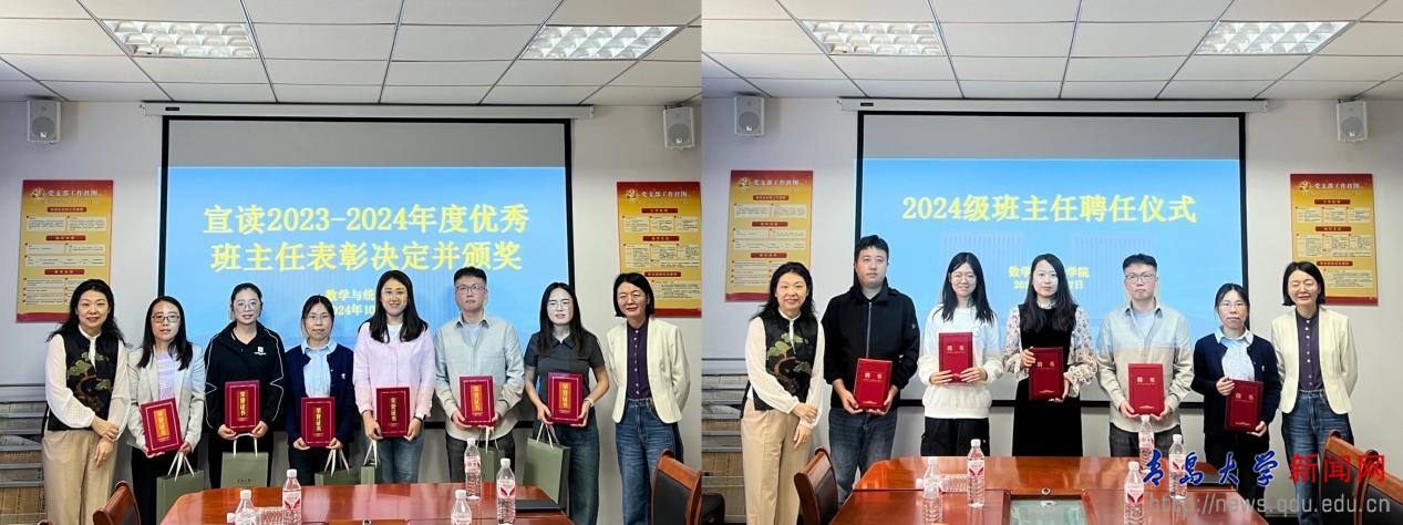 刘琪宣读《数学与统计学院2023-2024年度优秀班主任表彰决定》向优秀班主任颁发证书和奖品,并向2024级班主任颁发聘书,对班主任的扎实工作与潜心付出表示感谢。他表示,班主任、辅导员作为学生成长道路上的引路人,应持续深化立德树人理念,将德育工作贯育人工作始终,不断学习提升自身专业素养与育人质量。