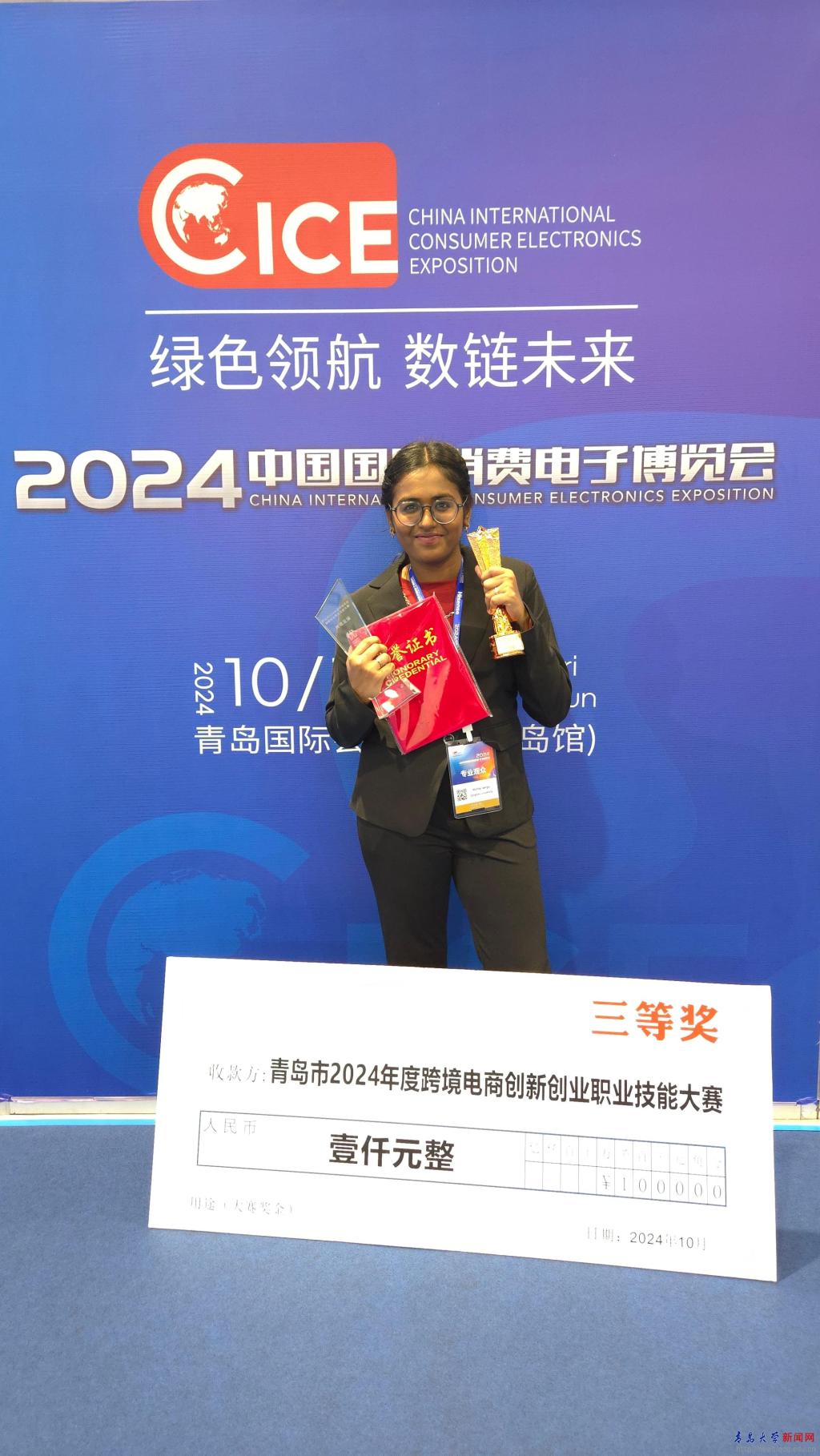 同日,由青岛市商务局、青岛市总工会、共青团青岛市委、青岛市工商业联合会、青岛市教育局、青岛市人力资源和社会保障局、上合示范区管委会主办,由青岛市贸易发展服务中心、青岛市进出口企业商会承办的青岛市2024年度跨境电商创新创业职业技能大赛决赛在青岛国际会展中心(红岛馆)举办,伟德官网医学部留学生贝塔所在“菁彩青岛”团队荣获TikTok短视频营销赛道三等奖,指导教师韩东荣获优秀指导教师奖。