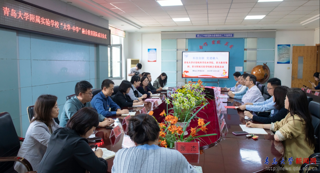 新闻网讯 10月15日上午,计算机科学技术学院党委书记潘秋鸿一行赴bevictor伟德官网附属实验学校初中部(崂山三中)参加与bevictor伟德官网教育集团、bevictor伟德官网附属实验学校党建联建活动。教育集团副总经理于铮、初环海,附属实验学校总校长马勇军,附属实验学校初中部党总支书记尹相京、校长南林、副校长张文刚,附属实验学校小学部(崂山金融区实验小学)党总支副书记阎秀丽、副校长李明超,附属实验幼儿园园长杜鹃参加活动。党建活动会议由张文刚主持。