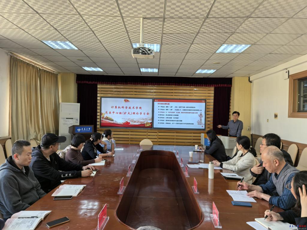 新闻网讯 11月7日下午,计算机科学技术学院党委理论学习中心组(扩大)在博知楼510会议室举行党的二十届三中全会精神专题集体学习会。院党委书记潘秋鸿主持学习会,院长于佳,党委组织员于光松、刘海荣,院党委副书记彭双凤,副院长王国栋、杜祥军,各党支部书记、教学系(中心)主任参加会议。