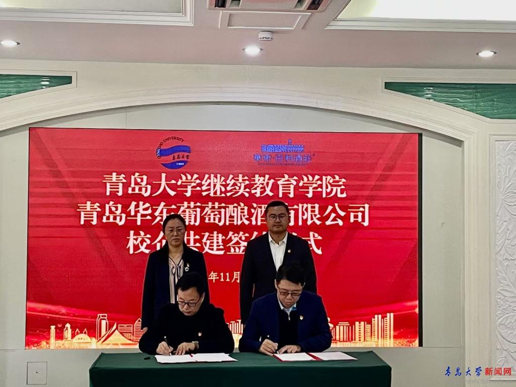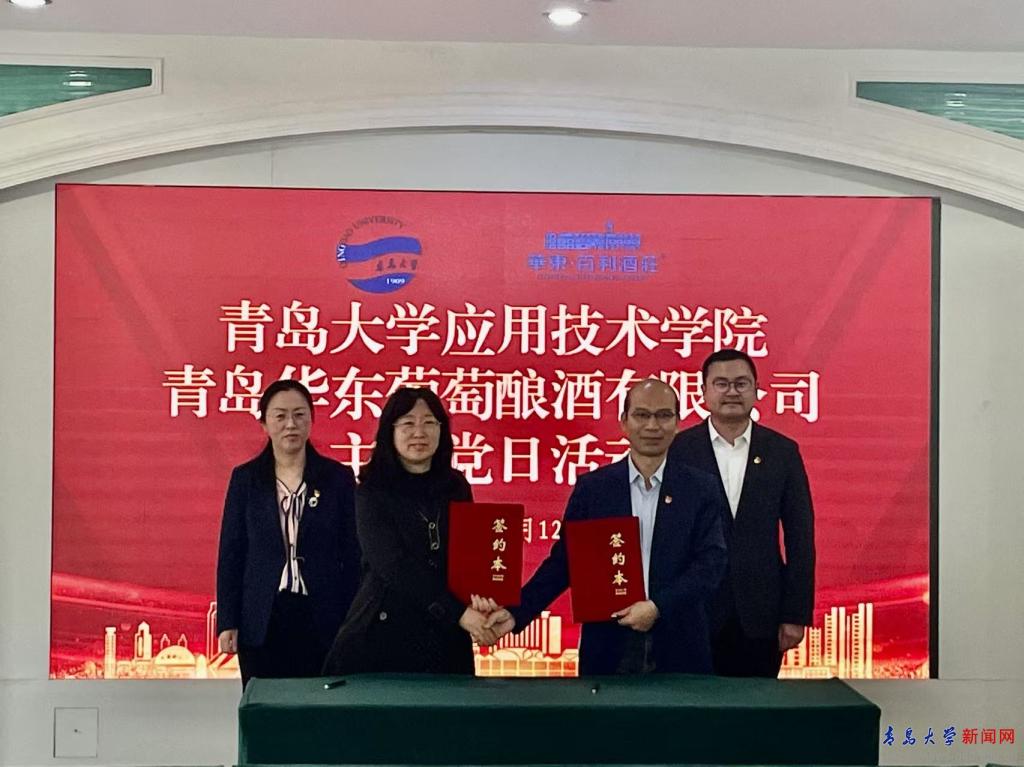 新闻网讯 11月12日上午,应用技术学院、继续教育学院与青岛华东葡萄酿酒有限公司在华东百利庄园联合举办“党建引领,赋能校企合作高质量发展”主题党日活动,双方签约共建教育培训基地、开展党建共建。华东葡萄酿酒有限公司党总支书记、董事长魏帅强,华东葡萄酿酒有限公司总经理嵇可琳,应用技术学院党委书记张燕,应用技术学院、继续教育学院党委副书记、院长耿宝福以及双方党员代表参加活动。