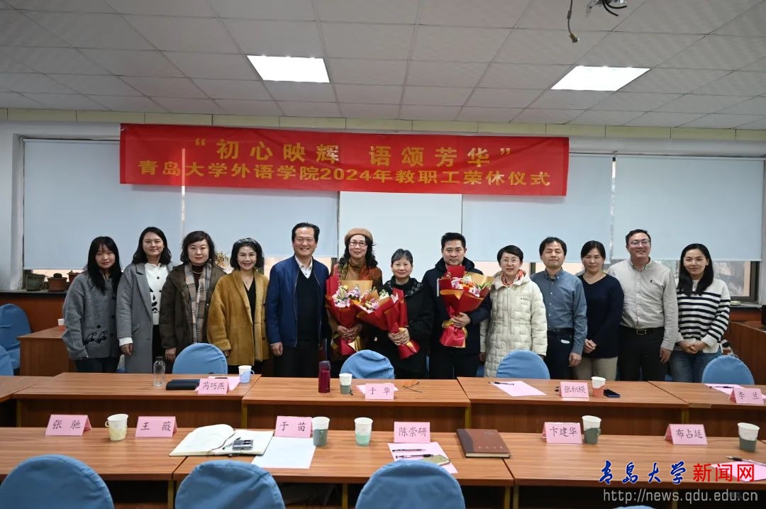 新闻网讯 12月12日,外语学院举办了“初心映辉,语颂芳华”2024年教职工荣休仪式。五位荣休教师及学院领导班子、各系办中心主任参加活动。