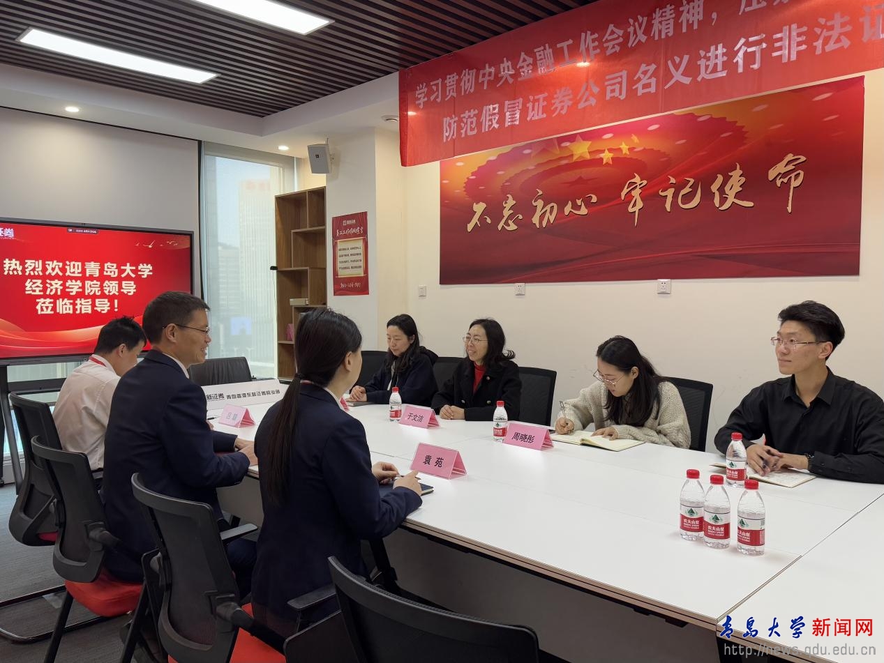 新闻网讯 12月27日上午,经济学院党委副书记于文洁带领毕业生一行赴国新证券股份有限公司开展“访企拓岗”活动。国新证券青岛营业部负责人王帅生,财富总监吕聪参加座谈活动。