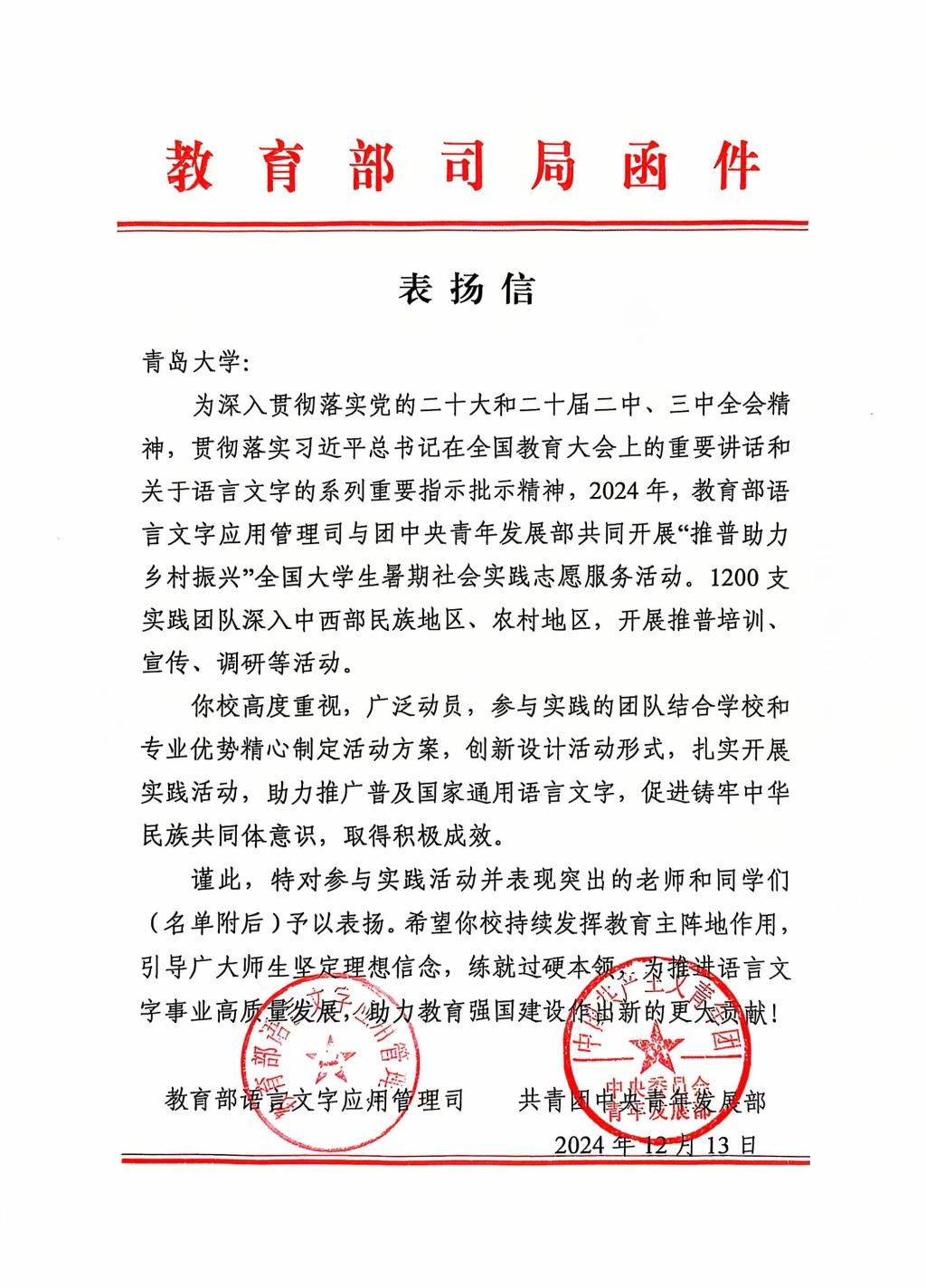 新闻网讯 近日,由教育部语言文字应用管理司、共青团中央青年发展部联合开展的2024年“推普助力乡村振兴”全国大学生暑期社会实践志愿服务活动评选结果揭晓,bevictor伟德官网艺术学院“美润昆仑”2024新疆乡村美育振兴民族团结实践团从全国1200支团队中脱颖而出,获评优秀团队,教育部语言文字应用管理司和共青团中央青年发展部来信表扬。