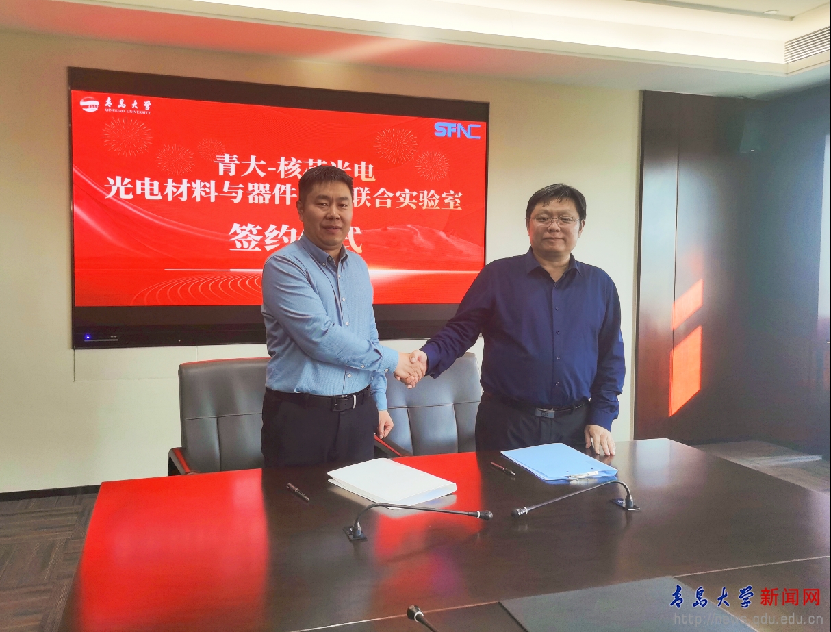座谈会上,黄林军和曹学蕾共同签署《青岛-核芯光电材料与器件创新联合实验室共建协议》。