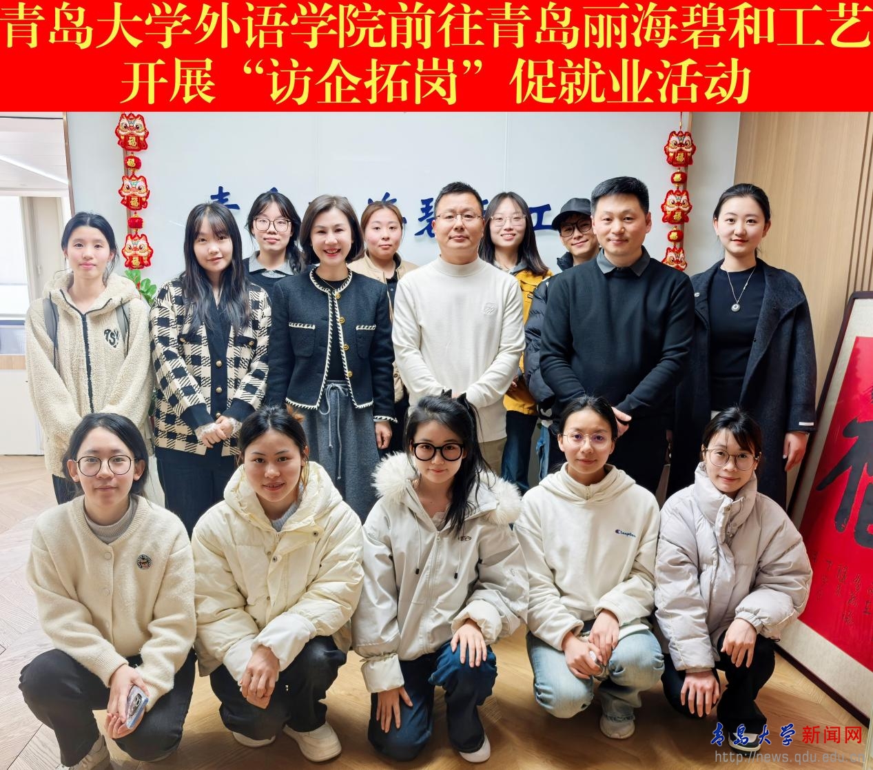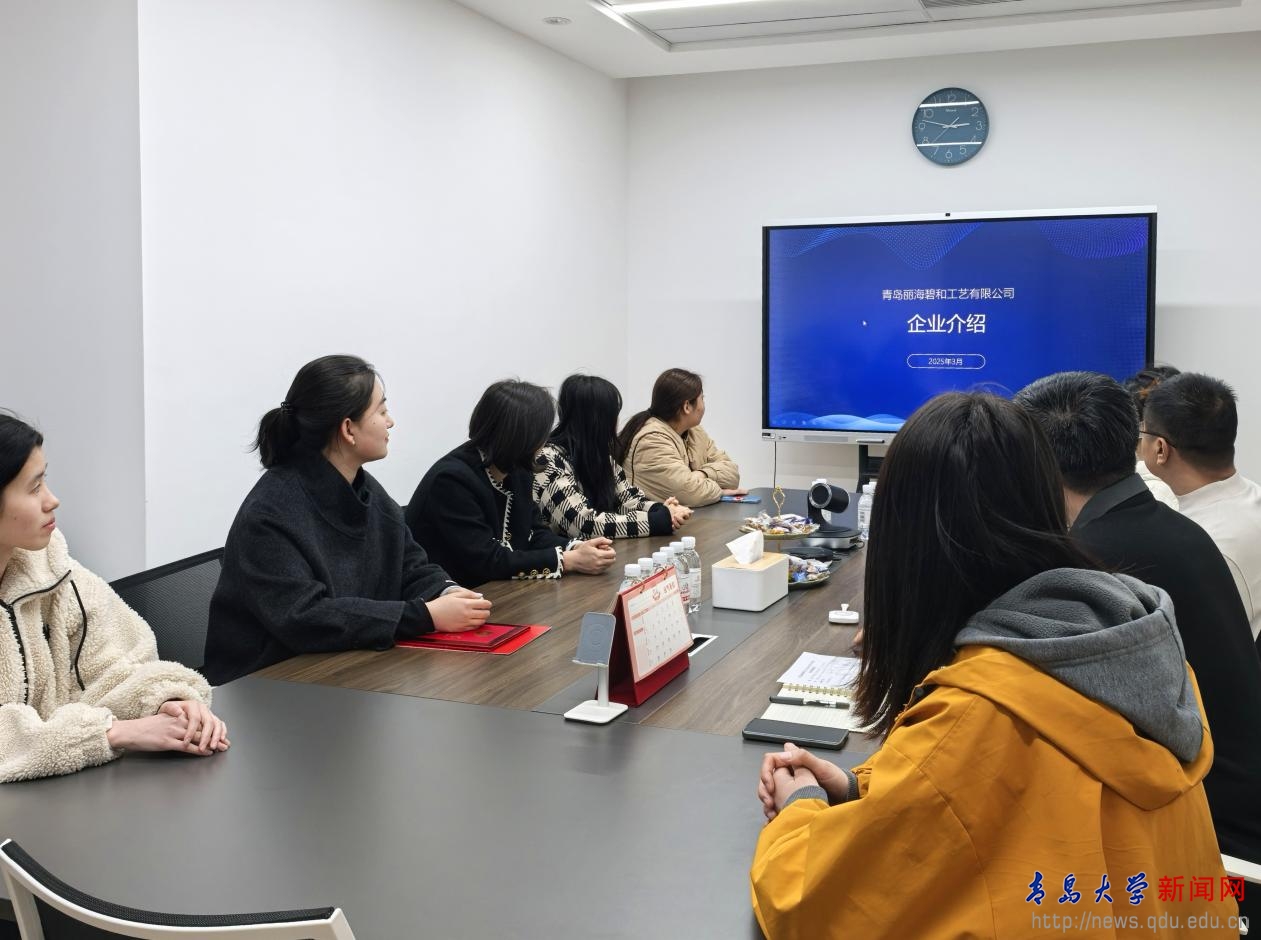 新闻网讯 为搭建全方位校企合作平台,拓宽学生就业途径,3月28日下午,外语学院党委副书记于苗一行带领学生代表一同深入走访青岛丽海碧和工艺有限公司。