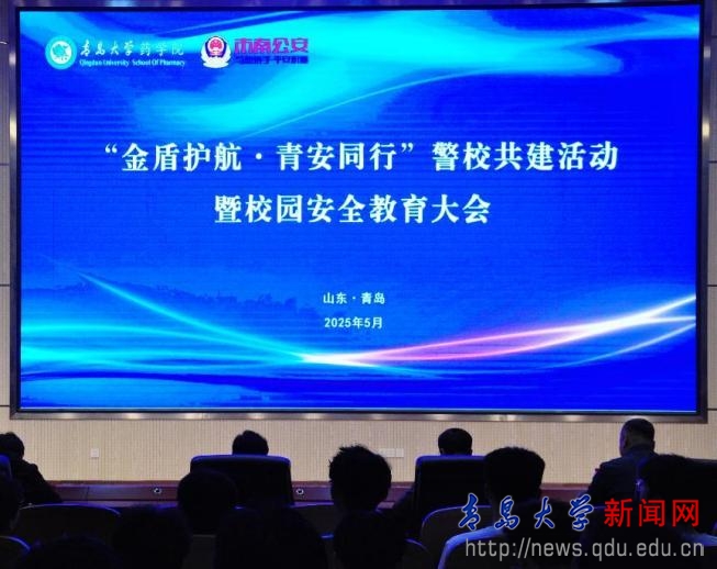 新闻网讯 5月15日下午,药学院联合青岛市公安局市南分局金门路派出所举办的“金盾护航·青安同行”警校共建活动暨校园安全教育大会在医学教育综合楼学术报告厅顺利举行。本次大会旨在进一步深化警校联动机制,强化校园安全教育,提升师生的安全防范意识与应急处理能力,为校园安全筑牢防线。