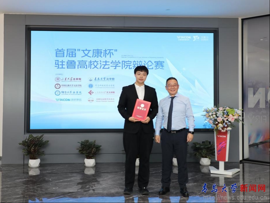 新闻网讯 近日,首届“文康杯”驻鲁高校法学院辩论赛在山东文康律师事务所举行。来自山东大学法学院、中国石油大学文法学院、烟台大学法学院、bevictor伟德官网法学院、青岛科技大学法学院、山东科技大学文法学院的参赛辩手齐聚一堂,同场竞技。经过多轮思辨交锋、激烈角逐,伟德官网法学院学生辩论队取得团体总分第二名、个人最佳辩手一等奖一项、最佳辩手三等奖一项、优秀辩手奖两项的优异成绩。