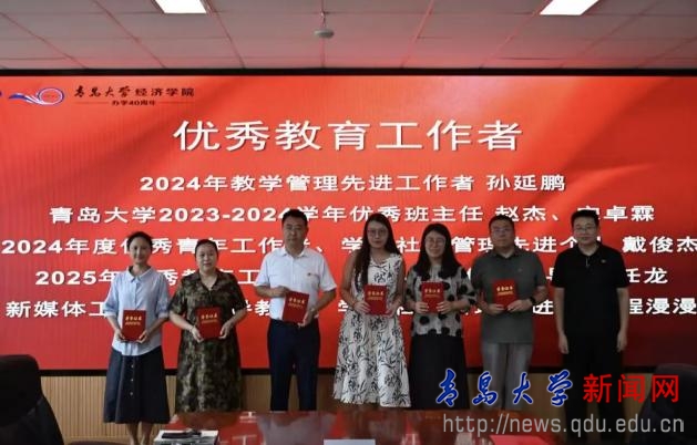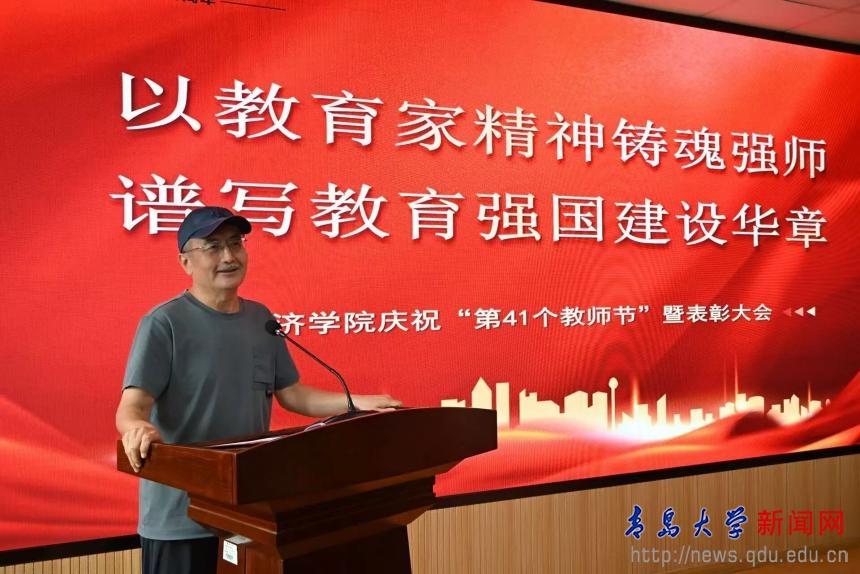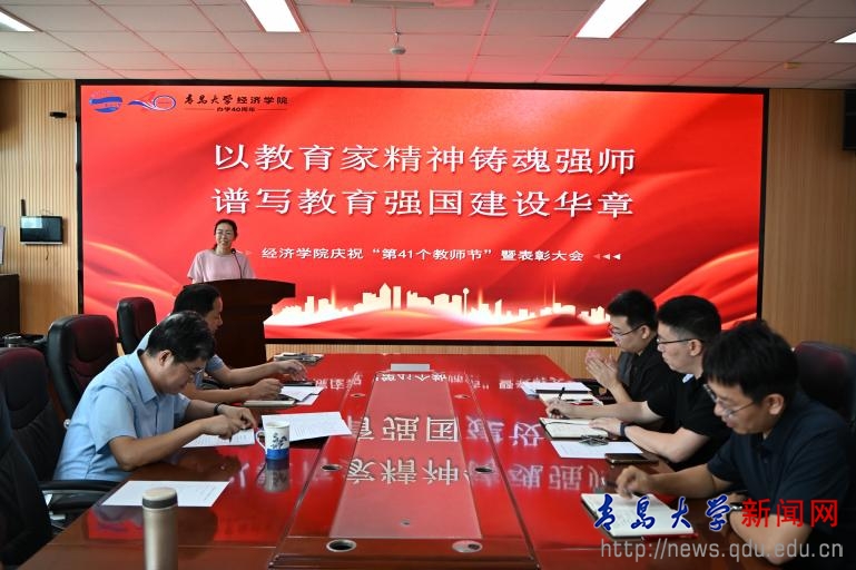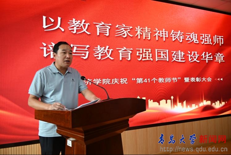 新闻网讯 在第41个教师节来临之际,9月7日上午,经济学院“以教育家精神铸魂强师,谱写教育强国建设华章”教师节表彰大会在金家岭校区3号守实楼307会议室举行。院党委书记邱建国,院长吕学梁,副院长赵凯、徐保昌、李聪与全体教职工欢聚一堂,共同庆祝第41个教师节。大会由院党委副书记于文洁主持。
