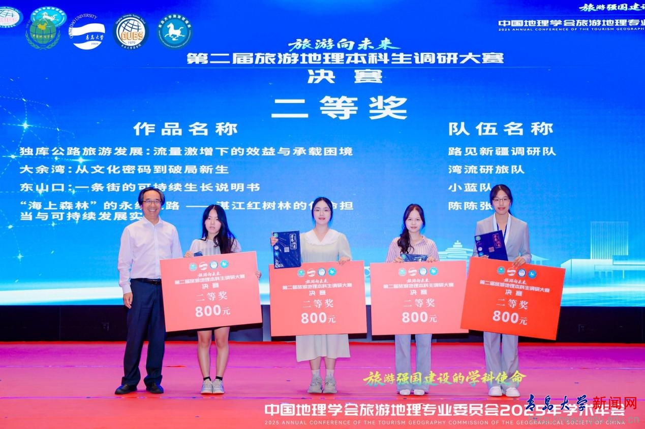 9月,在青岛举办的第二届旅游地理本科生调研大赛中,学院学子再次崭露头角。2024级地理科学(师范类)本科生徐文洁、赵嘉祥、董子琴、钟子恒、张兆震等,在鞠洪润老师的指导下,凭借作品《独库公路旅游发展:流量激增下的效益与承载困境》,从全国众多高校团队中脱颖而出,荣获二等奖。同时,2024级牟芮、李昱鑫、李兆龙、傅琳、王悦情5位本科生在徐雪老师指导下,以作品《青岛八大关的旅游与可持续发展》喜获三等奖。