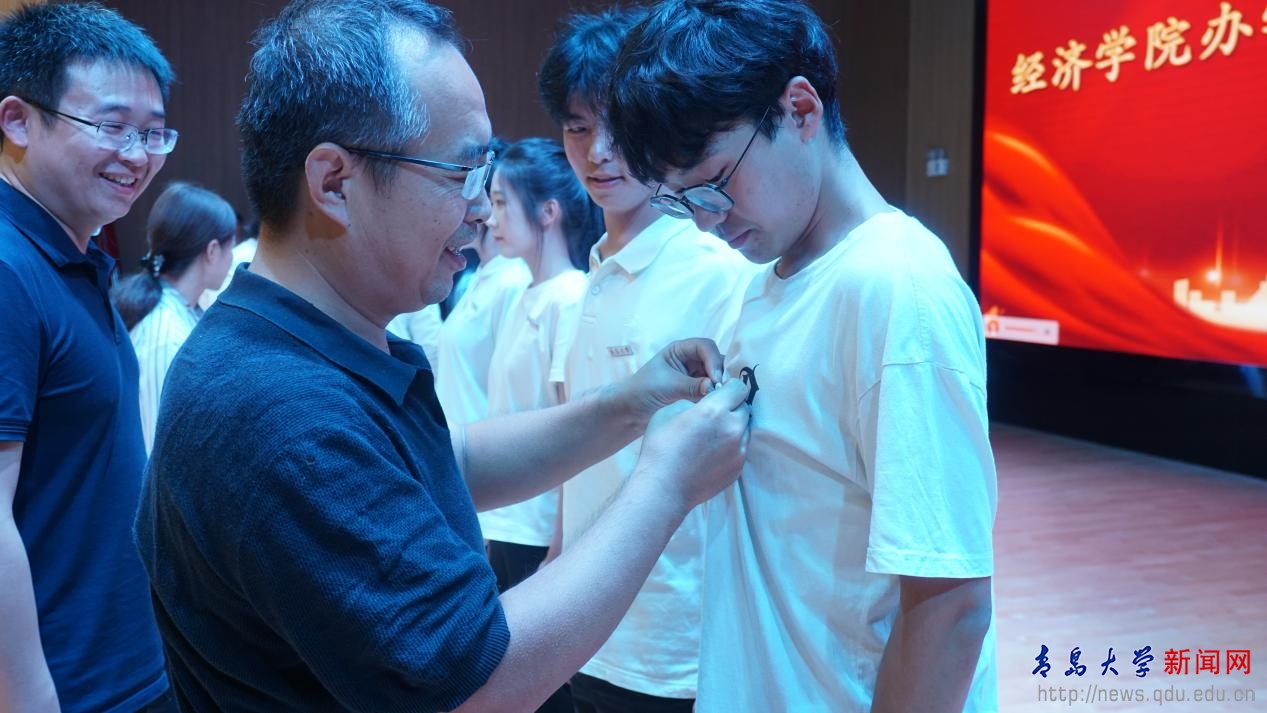 校徽佩戴仪式上,教师代表为新生代表佩戴校徽,象征着身份的传承与责任的交付,标志着2025级新生正式成为“青大人”,开启在bevictor伟德官网的求学之旅。