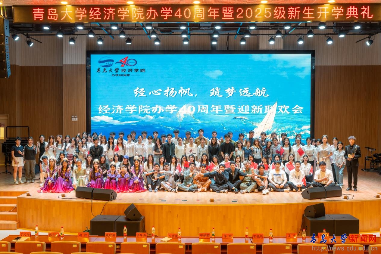 新闻网讯 9月26日,经济学院隆重举行2025级本科生开学典礼暨迎新联欢会。经济学院党委书记邱建国,院长吕学梁,副院长赵凯、李聪、徐保昌,院长助理宫晓莉,全体辅导员,教师代表,2025级班主任和全体新生参加典礼。经济学院党委副书记于文洁主持典礼。