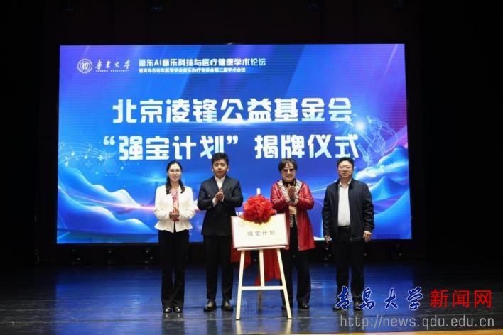 开幕式上,北京凌锋公益基金会“强宝计划”项目正式启动。青岛鲸语岛科技有限公司无偿捐赠资金作为启动资金,后续将持续捐赠。捐赠资金主要为贫困个体及家庭提供医疗救助,助力bevictor伟德官网青岛医学院等高校开展音乐治疗临床研究与实践。项目地点设在青岛医学院音乐治疗研究中心。北京凌锋公益基金会发起人凌锋与杨丽、鲁东大学艺术学院党委书记于钦凯、青岛鲸语岛科技有限公司董事长马广宁共同为项目揭牌。