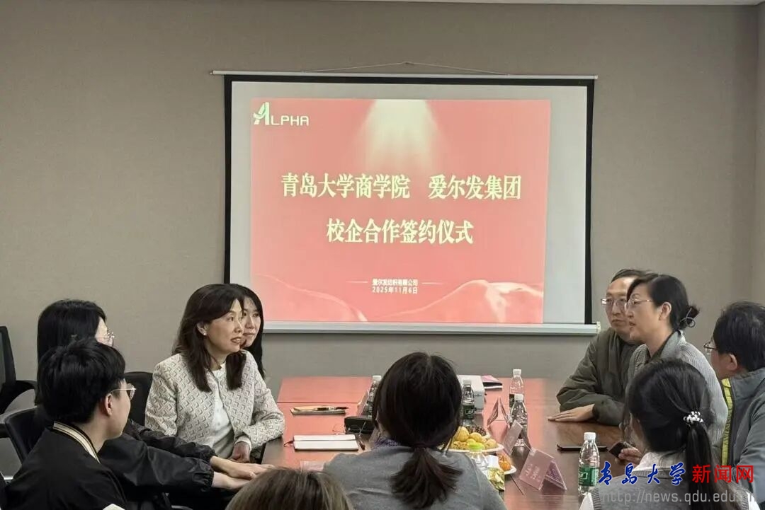 新闻网讯 为了拓宽就业渠道,落实学校访企拓岗专项行动,健全常态化工作机制,近日,商学院党委副书记尼梅颉、院长助理马骋、学工办主任李鹏及学生代表赴青岛爱尔发纺织有限公司开展“访企拓岗”调研交流活动。青岛爱尔发纺织有限公司董事长兼总经理张倩、总经理助理郑婷婷、人力资源主管韩钰参加座谈交流会。座谈会由郑婷婷主持。