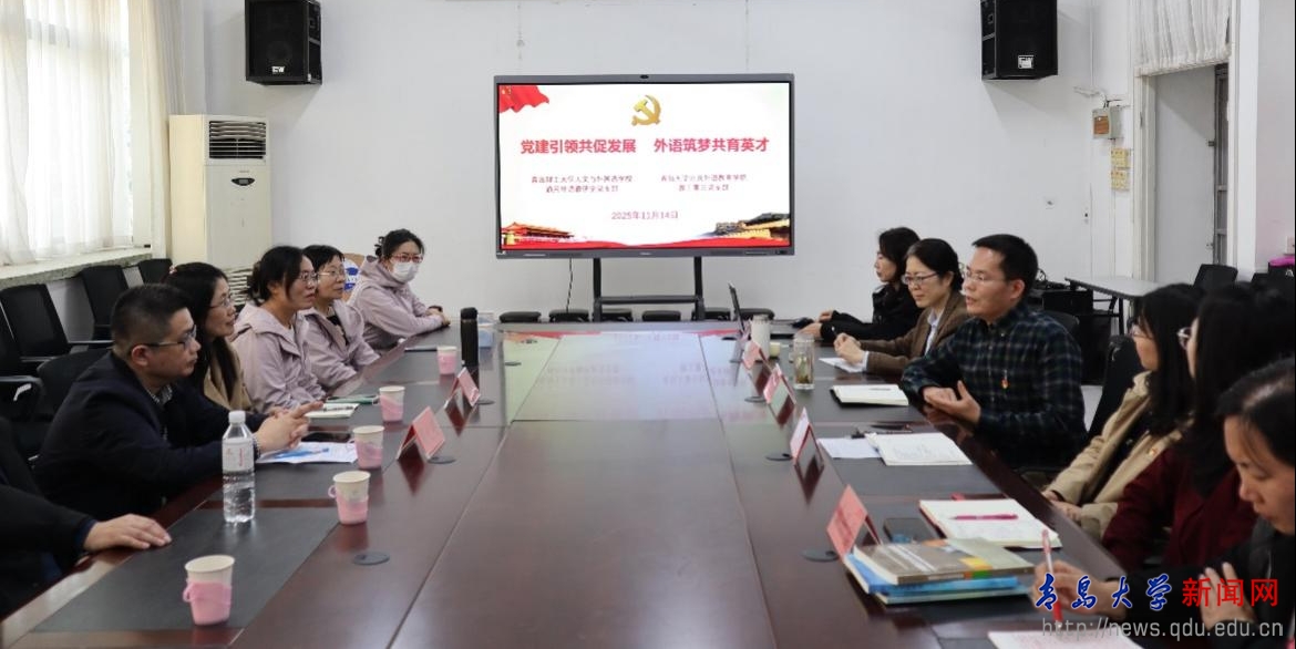 新闻网讯 11月15日下午,青岛理工大学人文与外国语学院通用外语教研室党支部书记王美玲带领支部党员老师与公共外语教育学院教工第三党支部在睿思楼202会议室开展了“党建引领共促发展,外语筑梦共育英才”支部共建暨主题党日活动,教工第三党支部书记李晓敏主持活动。