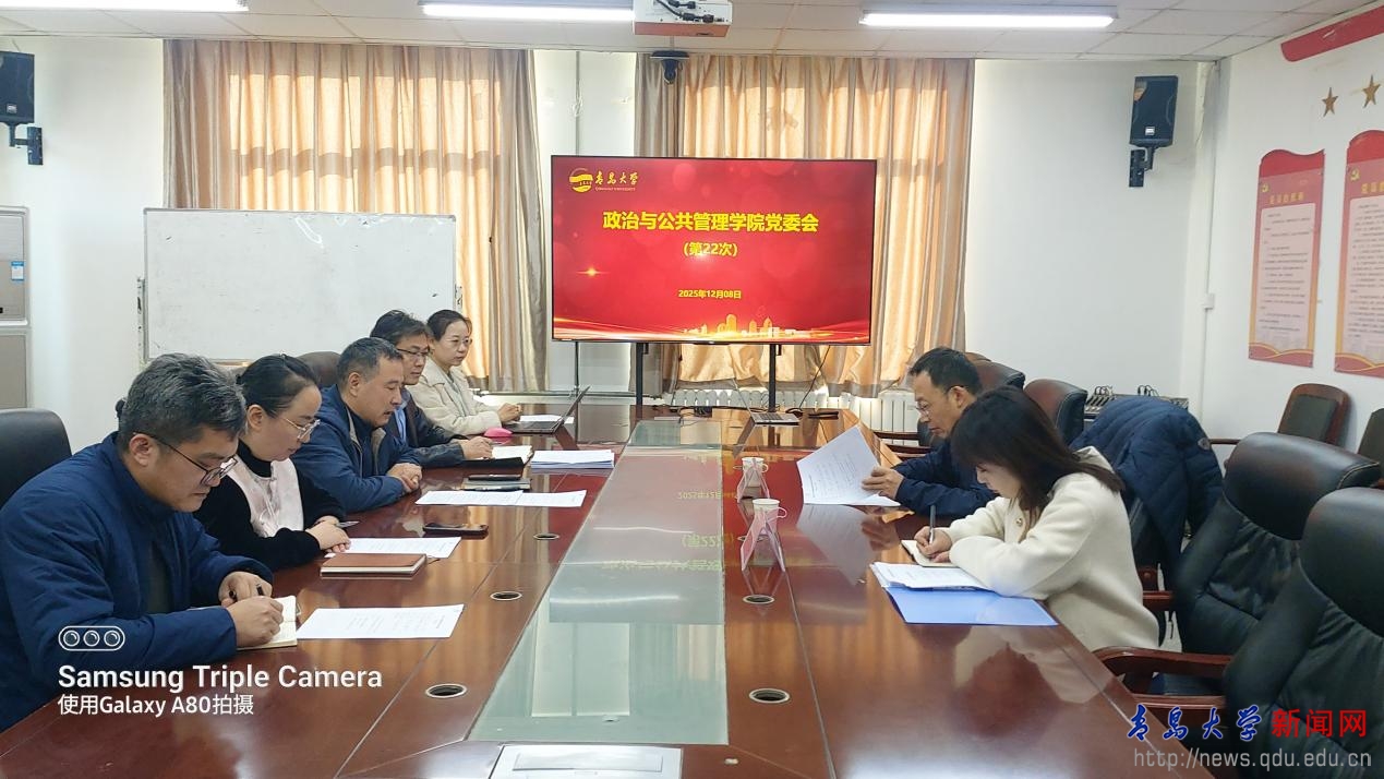 新闻网讯 12月8日上午,政治与公共管理学院在金家岭校区2号实验楼214会议室召开2025年第22次党委会和第26次党政联席会。校党委常委、副校长刘恩贤列席旁听并进行指导,列席旁听工作组成员党委组织部正科级干部张宁参加会议。