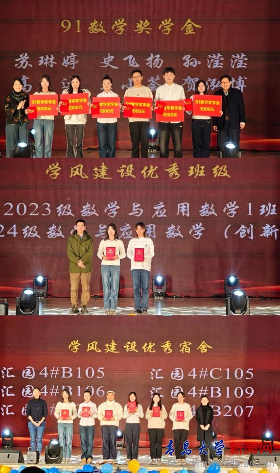 学风建设月表彰活动上,学院党政领导和校友代表为荣获本年度“91数学奖学金”、“学风建设优秀班级”、“学风建设优秀宿舍”的学生及集体颁奖。