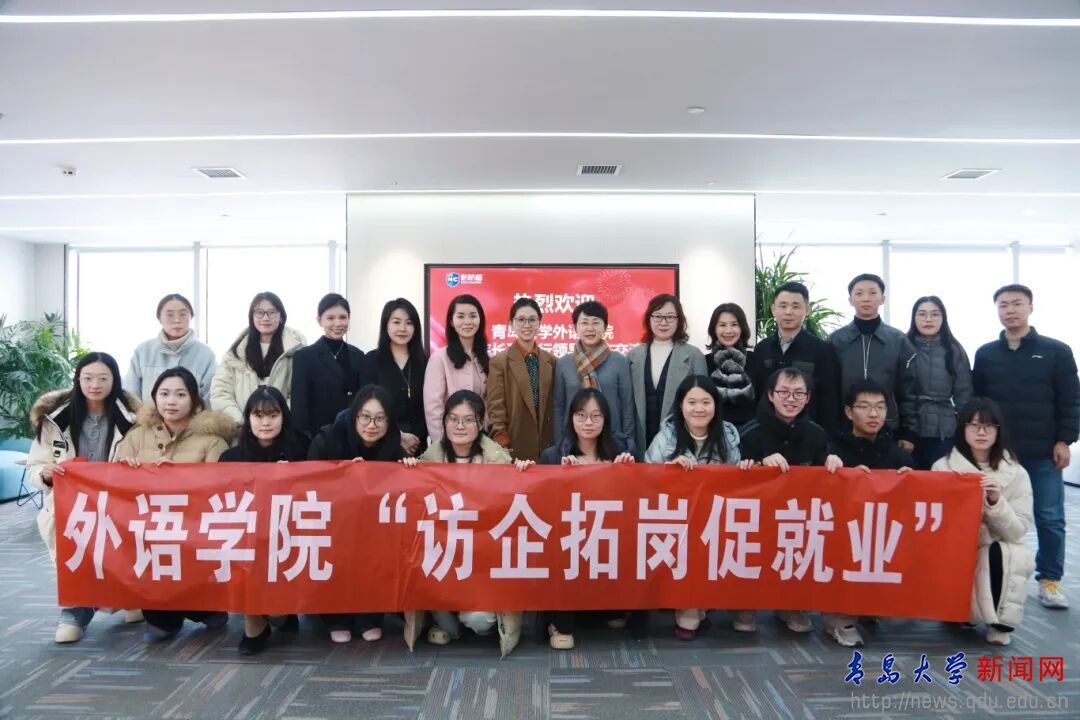 新闻网讯 1月6日下午,外语学院院长卞建华、党委副书记于苗、副院长王薇带领辅导员及学生代表一行,赴新航道青岛学校开展访企拓岗专项活动,并举行“人才培养基地”协议签订暨校外就业导师聘任仪式。新航道青岛学校副校长文雅丽、人力总监张丽丽等企业领导及核心团队参加活动。