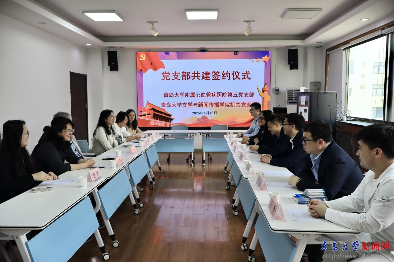 文学与新闻传播学院机关党支部书记张丹与附属心血管病医院第五党支部书记孙付明共同签署党支部共建协议。