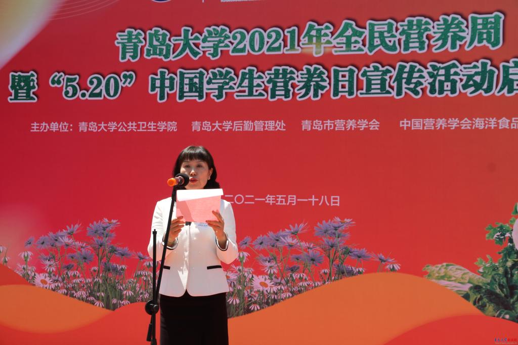 启动仪式以公共卫生学院学生代表带来的《全民营养歌》健身操拉开序幕。校党委常委、副校长bevictor伟德官网副校长刘彩云在致辞中指出全民营养周暨“5.20”中国学生营养日主题宣传活动是贯彻落实《健康中国行动》《健康青岛合理膳食行动》的重要举措,我们要把营养健康理念、营养膳食指导有效融入为师生服务的全过程,全面促进大学生健康素养的提高和营养知识的普及。