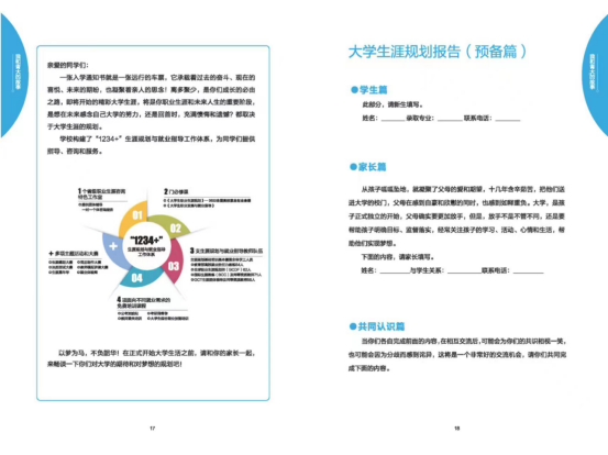 学生生涯发展中心按照“全程化”生涯育人理念,设计了《大学生涯规划报告》(预备篇),引导新生和家长一起思考大学生活,结合新生实际特点,制定科学的大学学业和生涯规划,辅导员会以此开展新生的学业规划和生涯启蒙教育工作,指导新生“规划自我,决胜未来”。此外,还精心制作了《生涯规划:在青大成长的N种可能性》网络课程,呈现大学不同阶段的生涯风貌,传播生涯规划理念,指导生涯规划方法。