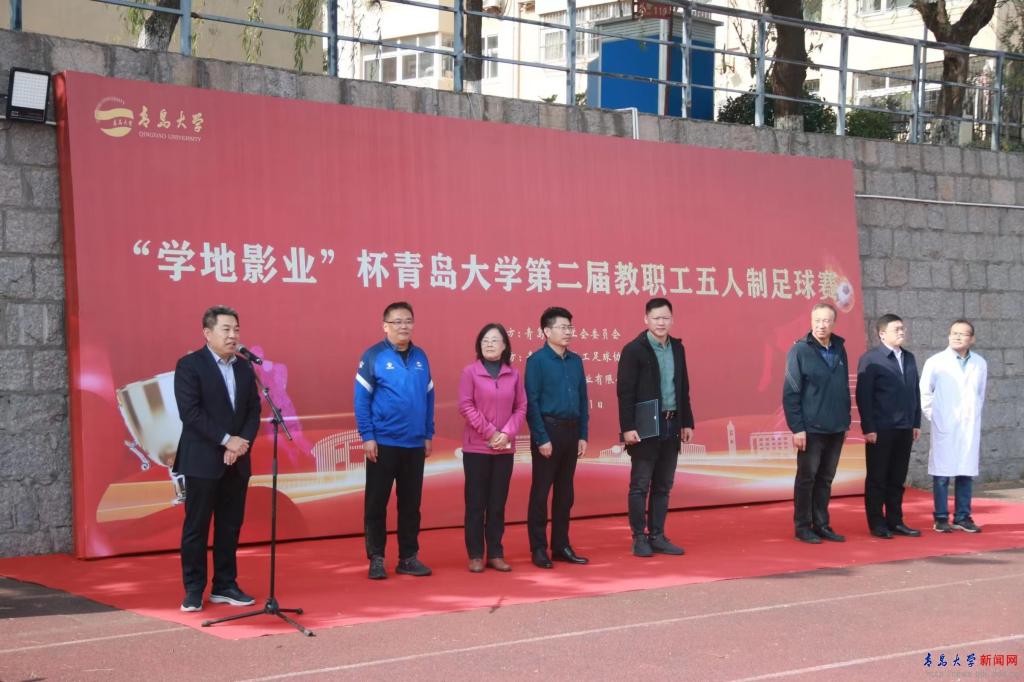 开幕式上,教工足球协会会长、音乐学院党委书记李建新介绍了比赛筹备情况。校工会主席张瑛为青岛学地影业有限公司总经理、伟德官网2010级计算机科学技术学院校友丛学地赠送赞助证书。