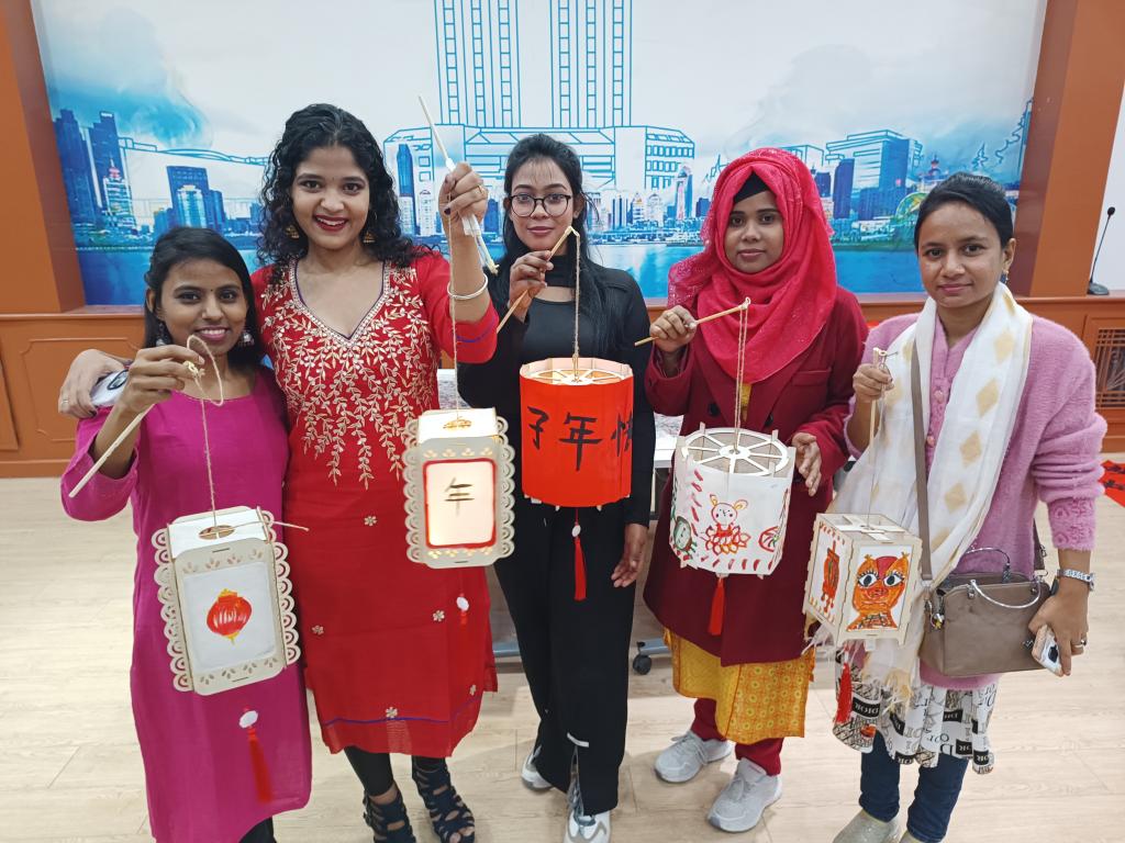 除了体验写对联、贴福字,留学生们还在美术学院民俗爱好者的指导下亲手制作了兔年民俗灯笼。兔年民俗灯制作过程完成后,留学生们集体展示了自己的劳动成果。