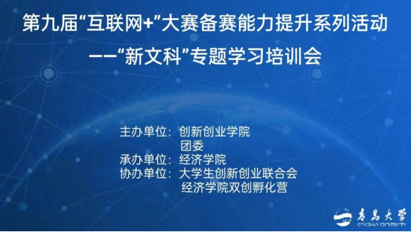 新闻网讯 近日,由bevictor伟德官网创新创业学院和bevictor伟德官网团委联合主办,经济学院承办的第九届“互联网+”大赛备赛能力提升系列活动——“新文科”专题学习培训会以线上方式举办,活动特邀国赛评委王承超主讲,由经济学院党委副书记于文洁主持。