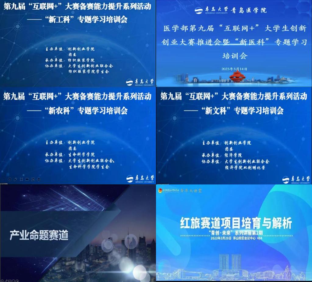 本次六场专题学习培训会由各学院各级领导老师协同努力,共邀请到9位高校和企业的双创领域专家,提高了老师同学们对"互联网+"创新创业大赛"四新"、产业、红旅赛道的认识和理解,激发了参赛热情。同时,明确备赛方向,为重点培育项目的备赛打下良好的基础。相信经过此次培训,青大学子能够以更深刻的认知、更全面的角度积极备赛,将学习到的专业知识和竞赛技巧应用于实践,最终取得理想成绩!