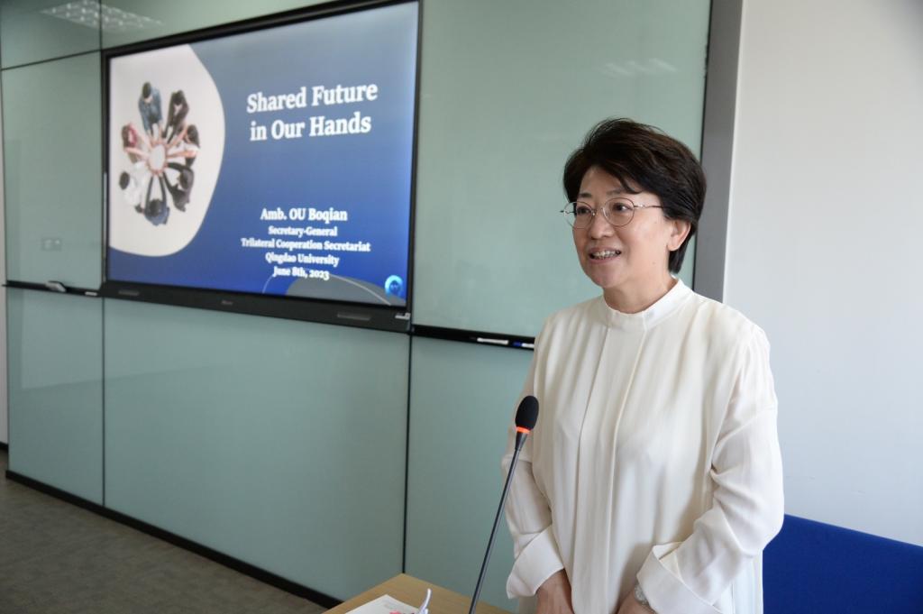 在提问互动环节,就同学们关心的“如何处理中日韩三边关系”“中日韩三国合作的未来走向”以及“中日韩城市外交面临的挑战”等问题,欧渤芊秘书长结合中日韩合作秘书处的具体工作实践进行了详细的解答。