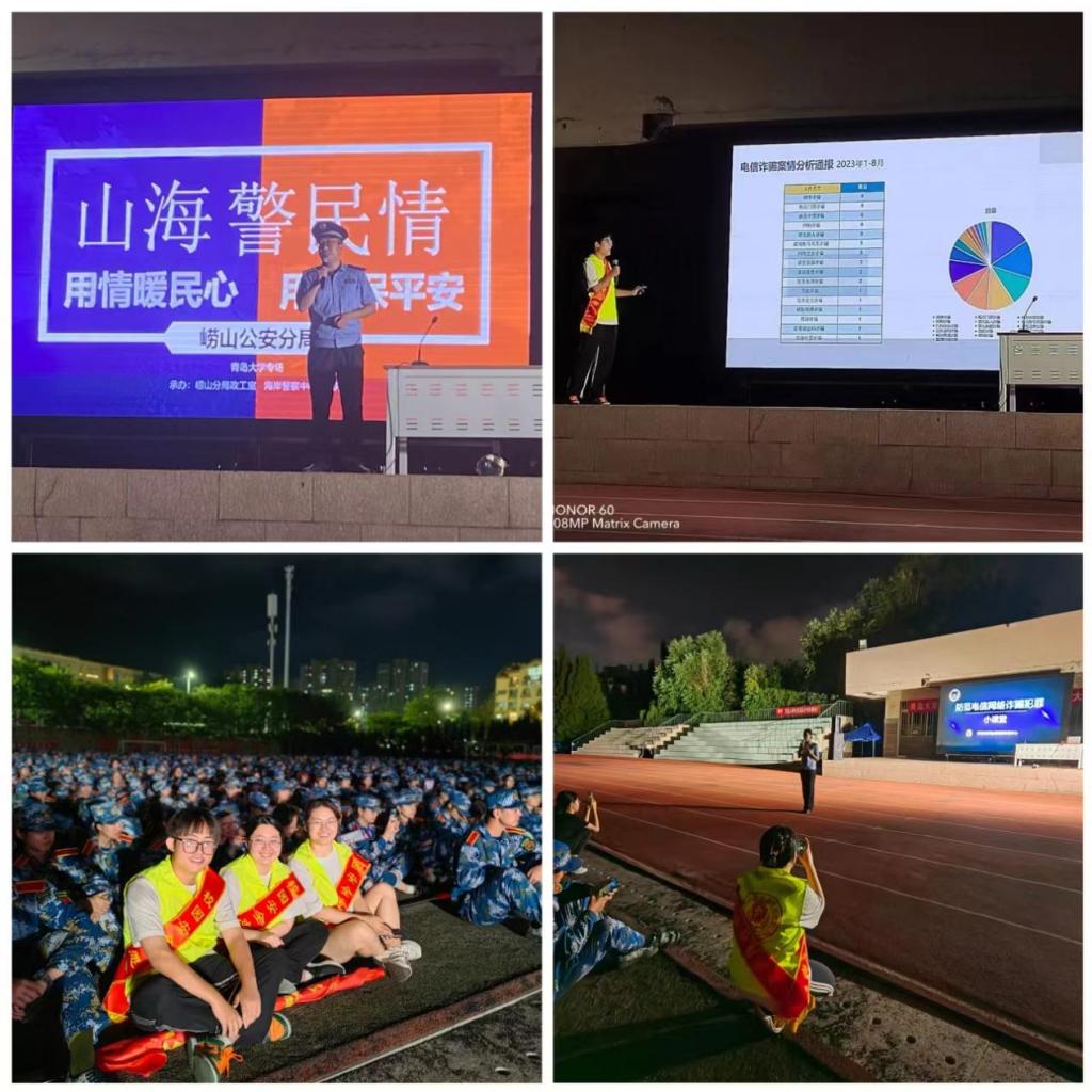 新闻网讯 9月5日晚,青岛市公安反诈中心、海岸警察支队中韩派出所、校党委保卫部把反诈课堂搬进军训操场,共同为2023级新生带来一堂“干货满满”的安全教育课。