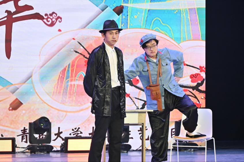 比赛中,戏曲《牡丹亭·游园》戏腔婉转;相声《罗密欧与朱丽叶》别具一格;小品《断片》奕奕传神,选手们精心编排、倾心演绎,以满腔的热情描摹青大青年昂扬的姿态。这些作品中有幽默诙谐的段子,也有感人至深的情节,选手们精湛的技艺和独特的表演风格赢得了现场观众的阵阵掌声。决赛现场由大学生艺术团表演的器乐合奏《象王行》和群舞《灼灼芳华》给观众带来更加丰富多彩的观赛体验,由青岛市歌舞剧院说唱团国家二级演员李强带来的嘉宾节目山东快书《打扑克》更是生动展现了经典曲艺作品的魅力。