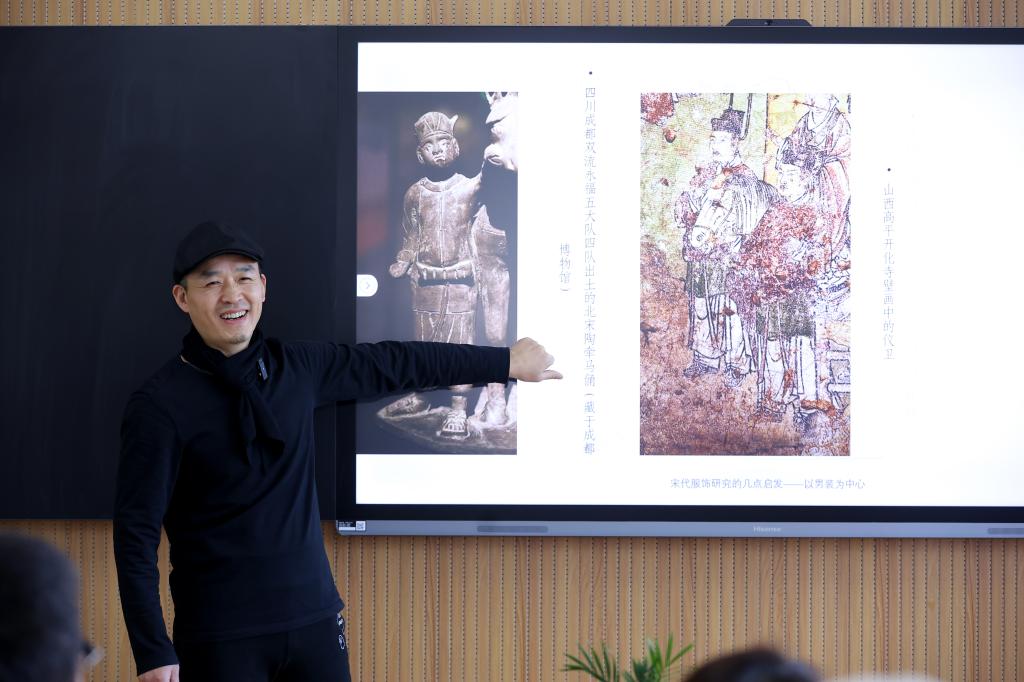 黄智高从当代艺术创意之惑引出“古装剧服化道要符合历史真实”的重要观点,强调设计师应懂得中国元素的来由与范畴。他结合出土文物和已有研究成果,就“衣裤装是胡服还是汉服”“十字形剪裁是否一统汉人天下”“隋唐之后下裳是否为女性专利”“陶渊明‘肩搭小袖’是怎样的结构”“北宋是否又开启了一次服饰大变革”等有争议的学术问题阐述自己的观点,认为“传统服饰从未定型,历代史实证明其一直在演变,不变的是内涵”,传统服饰文化的传承与创新应在深刻理解其来龙去脉的前提下,“弱其形而强其意,轻其构而重其色,去其范而承其艺”,“秉持中华观念、中华方式、中华元素,不离本宗,予以灵活驾驭”。他还提到,面对AI时代的挑战,设计师更应不断深研传统服饰文化,将传统价值观与美学意蕴融入现代服饰设计,守住艺术设计的“独门绝技”。