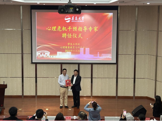 培训会上,陈涛为唐海波教授颁发“心理危机干预指导专家”聘书。