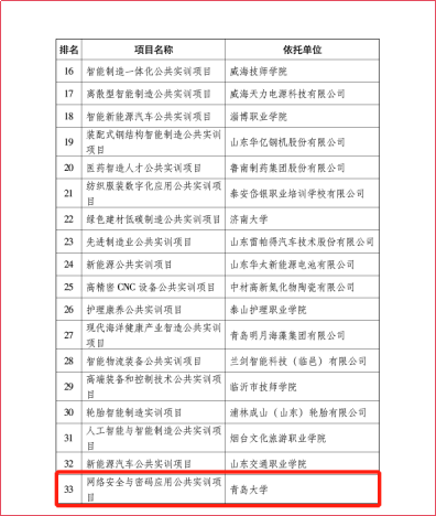 根据《山东省新旧动能转换公共实训项目建设及奖补资金管理实施细则》,为加快培养创新型、实用型、技能型人才,打造高技能人才培养高地,加快推动全省经济高质量发展,省工业和信息化厅围绕“十强”产业和传统优势产业,聚焦十一条标志性产业链,组织开展了山东省新旧动能转换公共实训项目建设工作。经过推荐申报、专家评审、社会公示等程序,共确定3所本科高校、16所高职和职业学校、31家企业建设的公共实训项目为山东省新旧都能转化公共实训项目。伟德官网计算机科学与技术学院咸鹤群教授主持申报的网络安全与密码应用公共实训项目经过学校申报、省教育厅评选推荐,在省工业和信息化厅组织的最终评选中胜出。