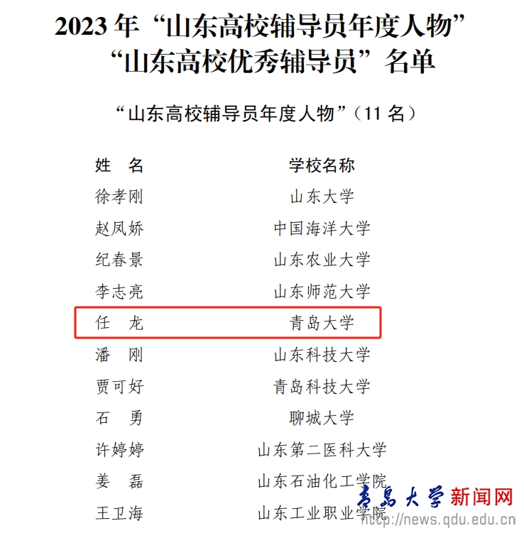 新闻网讯 近日,中共山东省委教育工委公布了2023年“山东高校辅导员年度人物”“山东高校优秀辅导员”评选结果,伟德官网辅导员任龙获评2023年“山东高校辅导员年度人物”荣誉称号。