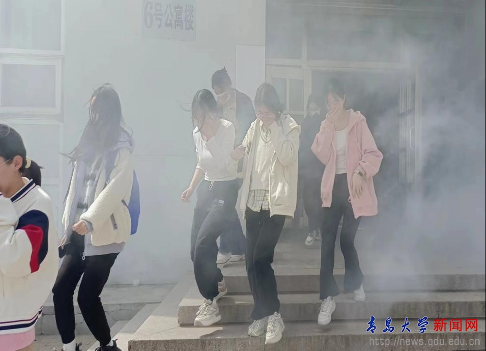 在疏散逃生演练环节,随着警报声响起,逃生现场浓烟滚滚,同学们用湿毛巾捂住口鼻,弯腰俯身,按照疏散线路从安全出口有序、迅速撤离至指定地点。