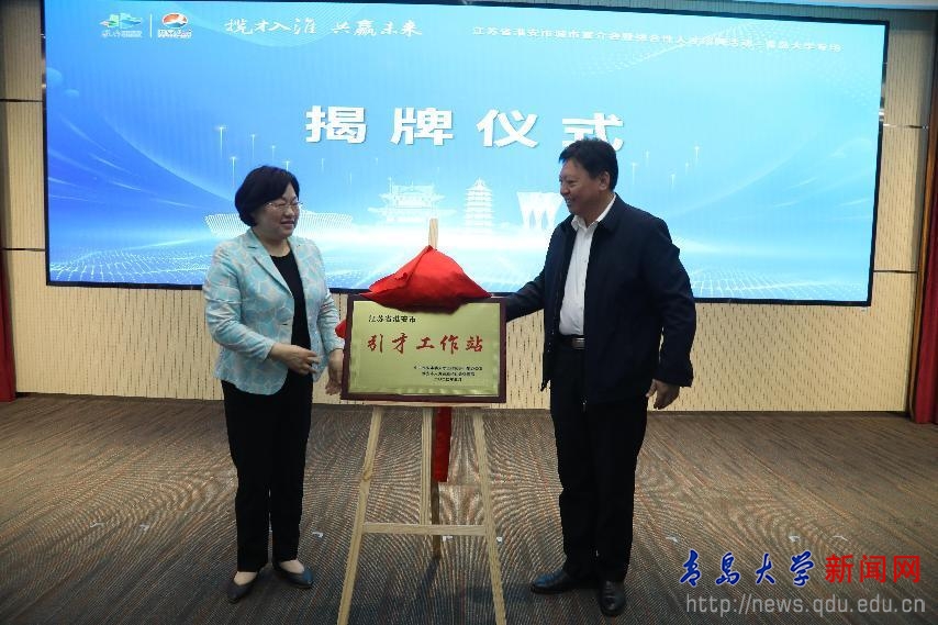 陈涛和王向红为“淮安市引才工作站”揭牌。