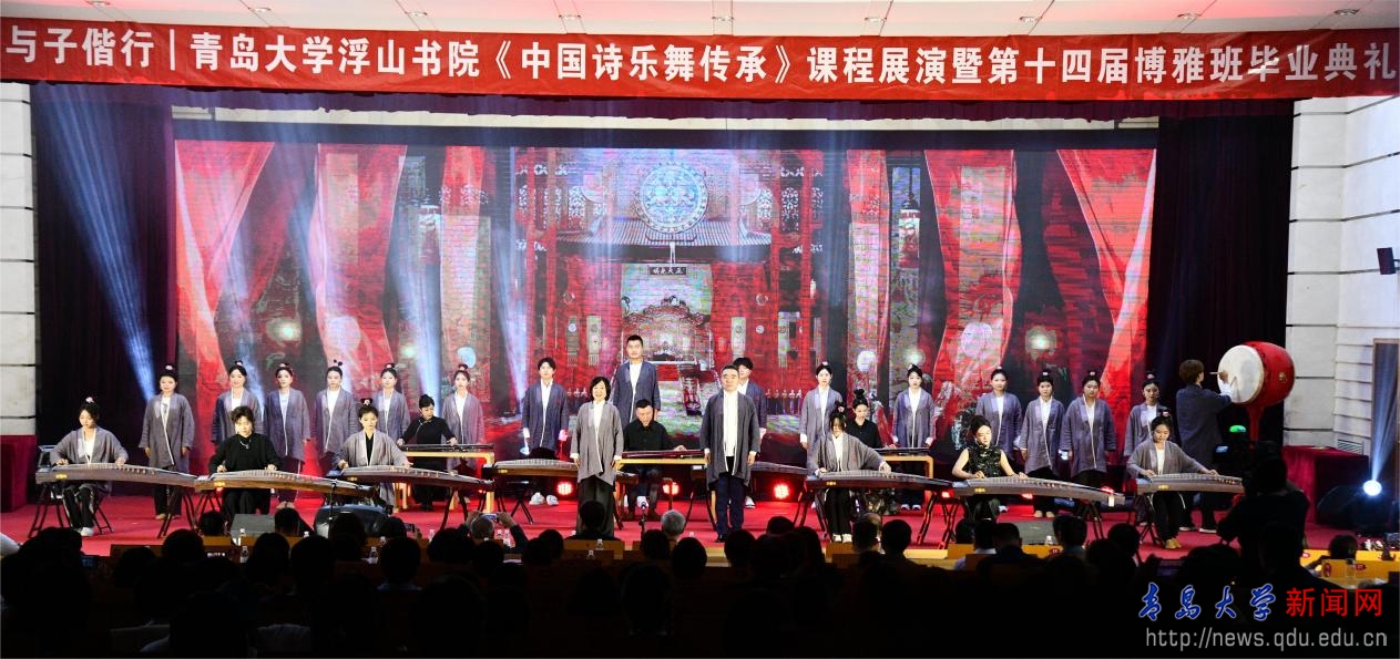 《中国诗乐舞传承》是浮山书院2021年起开设的一门美育通识课,由音乐学院教师刘宇博、王锐主讲。课程将中国古典诗词吟诵、演唱、乐舞以及中国民族器乐演奏相融合,采取体验式教学方式,带领学生进行作品编创与表演。自课程开设以来,每年面向全校师生举行结课展演,迄今已连续四年。这门课程是浮山书院对美育的全新探索,也是对中华礼乐文明的传承与致敬。