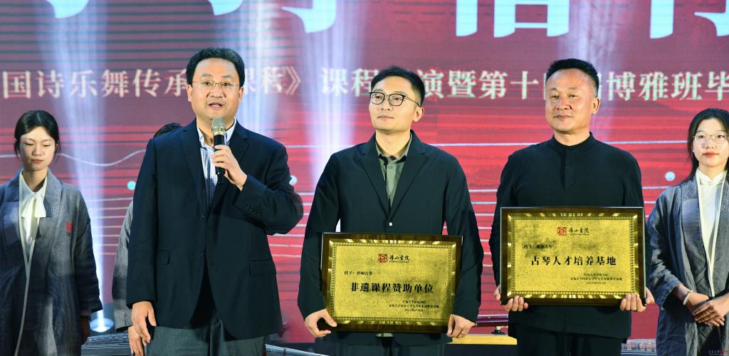 活动伊始,举行了捐赠授牌与颁发聘书仪式。浮山书院教学所用的古琴、古筝全部来自于爱心人士的捐赠。李建波为离染古琴董事长陈永东、唐响古筝董事长齐亚斌颁发了捐赠纪念牌。创新创业学院常务副院长王海荣为赵霄鹏工作室幽缦国乐、战鹏程琴筝艺术中心、官赛古筝三个机构颁发了“美育实践支持基地”铭牌。教务处副处长李传军为孙小娥、任洁、于月颁发了“浮山书院美育导师”聘书。