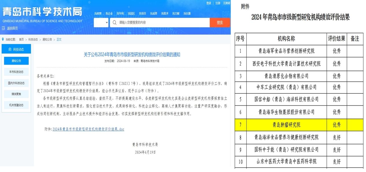 新闻网讯 日前,青岛市科学技术局正式发布2024年度青岛市新型研发机构绩效评价,伟德官网青岛肿瘤研究院获评优秀成绩。