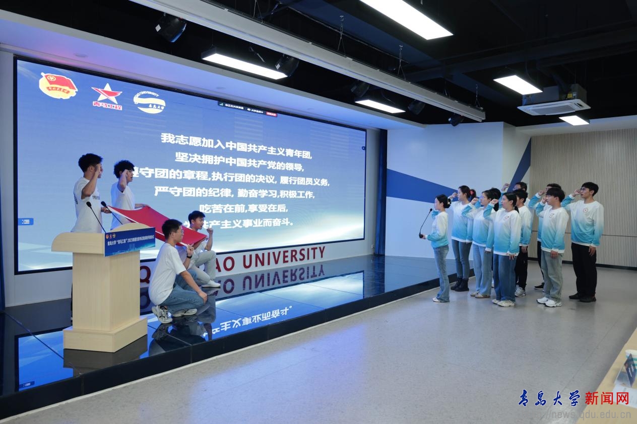 团干部为2023级团支部书记代表佩戴团徽、授书。在重温入团誓词环节,由2023年“青马工程”大骨班各团支部团支书领誓。